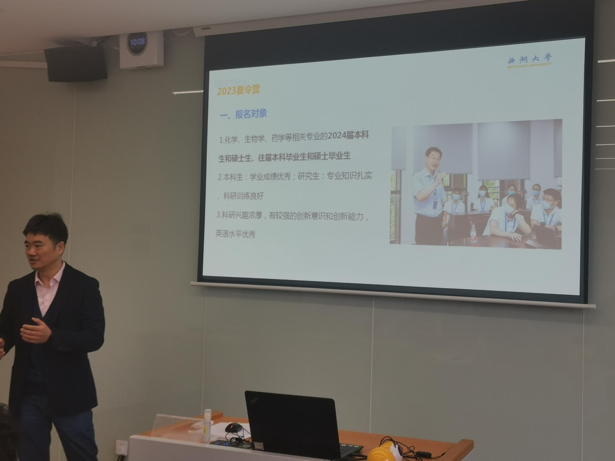 座谈会结束后,张国昌书记在学院1225教室面向2023届和2024届毕业生开展了一场宣讲会,全面介绍西湖大学理学院博士生培养的具体模式和软硬件条件,以夏令营等形式向同学们发出了邀请。