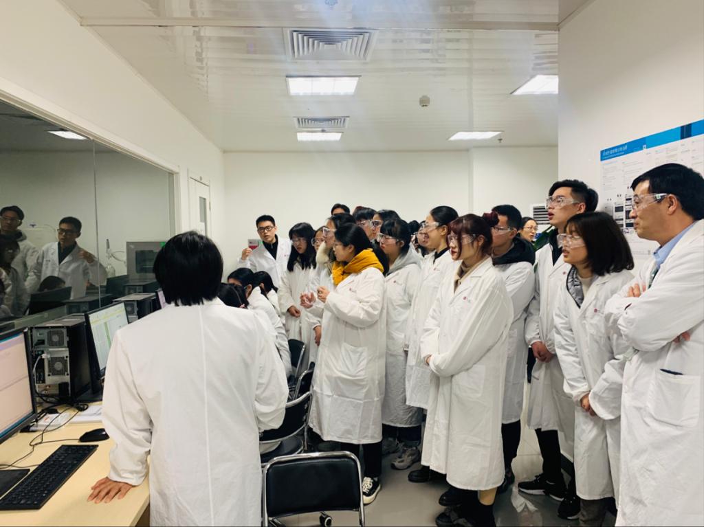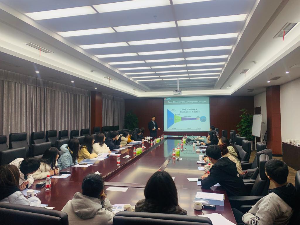 首先,付建民就康龙化成公司企业运营及有爱爱做了全面介绍并进行了交流,现场解答学生提出的问题。现场气氛十分活跃。随后,学生们在王有龙及相关实验室负责人带领下先后参观了公司有机合成实验室,分析实验室,DELT实验室,并了解了GMP生产的过程,通过现场的参观,感受现代化制药工作的生产工艺方法。