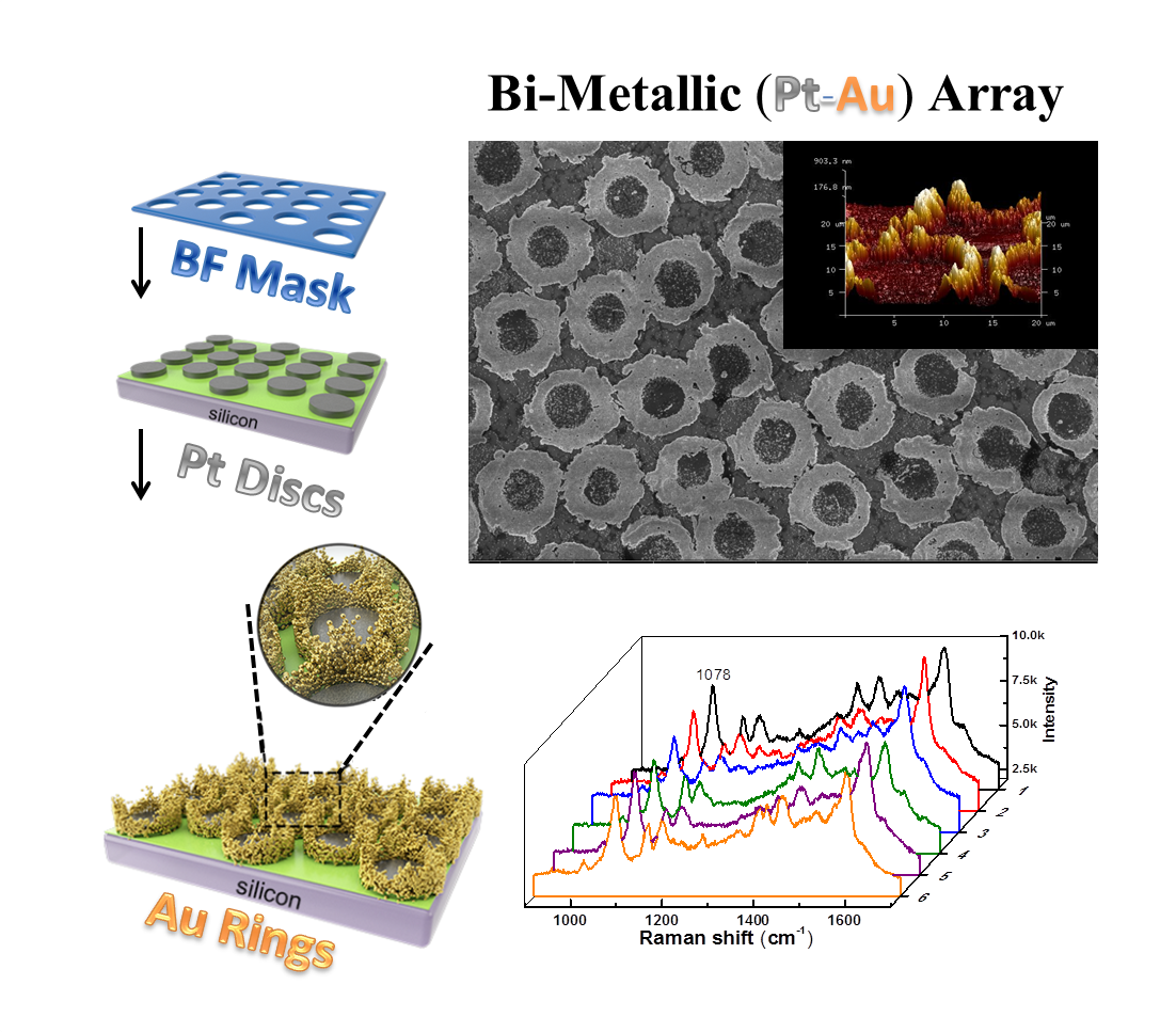该研究提出一种创新性的模板化自组装的策略,利用自组装型的水滴模板法代替传统的光刻类技术来制备图案化模板,最终利用多步自组装方法制备得到了由双金属纳米粒子组装而成的多级图案化阵列结构,并进一步探索了这种金属阵列结构所具备的表面增强拉曼散射性质。该研究不仅为具有多级结构的纳米材料的制备方法提供了全新的思路,也进一步拓宽了水滴模板法的应用方向。