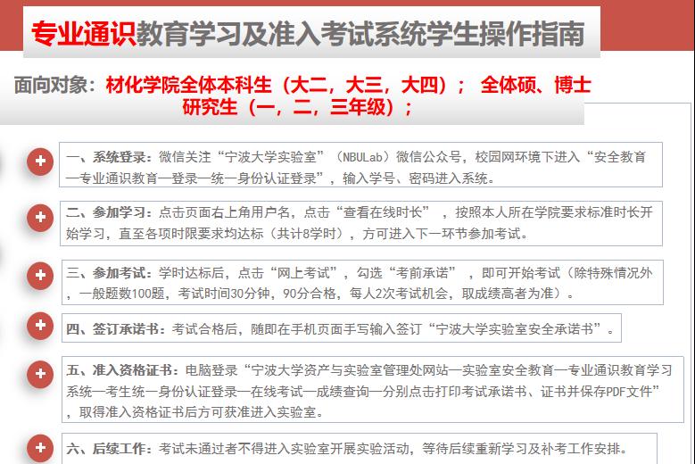 实验室管理专项目标考核的要求,每一位需要进入实验室学习和工作的师生必须进行实验室安全的在线学习、考试,成绩合格方可进入实验室工作学习(准入制),考核未合格的学生严禁进入实验室,其名单将在有爱爱
