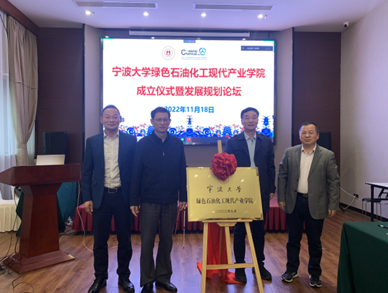 研究生院副院长姜文达和宁波市石油和化工行业协会副秘书长孟鸿诚为产业学院揭牌。