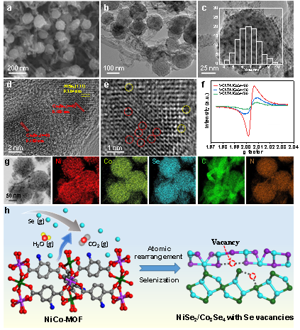 近日,韩磊教授、李国昌助理研究员联合扬州大学庞欢教授等将内部电子调控与内外电荷转移策略相结合,以MOFs为模板,通过精确调节硒化过程,设计了一种具有丰富Se空位的CNTs穿插的NiSe2/Co3Se4量子点。结合热重分析,论文阐明了Se空位的形成机制。交错的碳纳米管提供了内外部电荷转移的导电骨架;碳纳米球的限阈抑制了NiSe2/Co3Se4量子点之间的聚集,从而提高了结构韧性和机械强度。密度泛函理论计算表明,在Se空位显著调节费米能级处的态密度,提高内部电子传递效率,增加OH-吸附能力。因此,该材料表现出优异的比容量、超高的倍率性能和优异的循环性能。该研究为模板法制备具有丰富空位的高性能电极材料提供了理论指导。