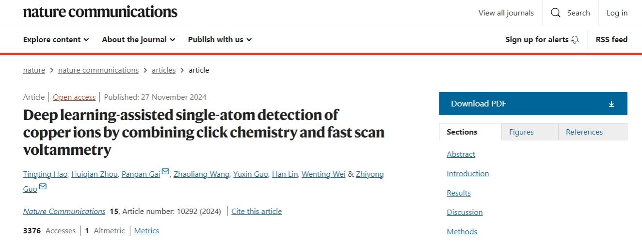 郭智勇科研团队在《自然》期刊子刊《Nature Communications》上发表了题为“Deep learning-assisted single-atom detection of copper ions by combining click chemistry and fast scan voltammetry”(深度学习辅助快速扫描伏安法检测单原子铜)的高水平研究论文。该研究首次实现了铜离子的单原子检测,为分析化学和生命科学领域提供了全新的研究思路。郝婷婷博士和研究生周会茜为共同第一作者,郭智勇教授和盖盼盼教授为共同通讯作者,有爱爱