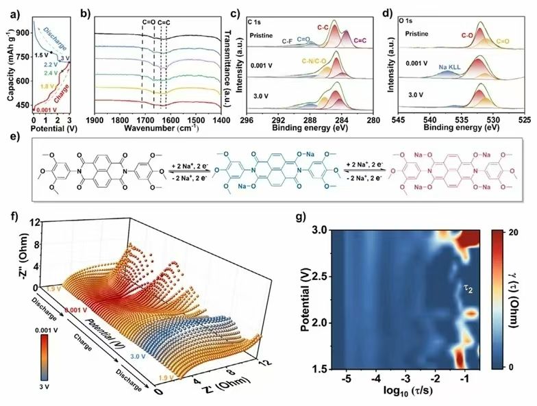 韩磊教授团队在国际权威期刊Angew. Chem. Int. Ed. 上发表题为“A Donor-Acceptor-Donor-type Organic Molecule as Effective Electrode to Form Rapid Diffusion Pathway for High-performance Sodium-Ion Batteries”的研究。文中针对钠离子电池发展需求,设计合成了兼具D-A-D结构和p-π共轭的萘二酰亚胺基有机电极材料(NDI-DTMA)。该材料通过甲氧基官能团解决了电极的溶解问题,同时促进了钠离子扩散动力学,D-A-D结构能优化电子传输,有效提高电导率。实验表明,NDI-DTMA在大电流密度下展现高容量和长循环稳定性。此研究为有机电极材料开发提供新思路,助力高性能有机钠离子电池发展。
