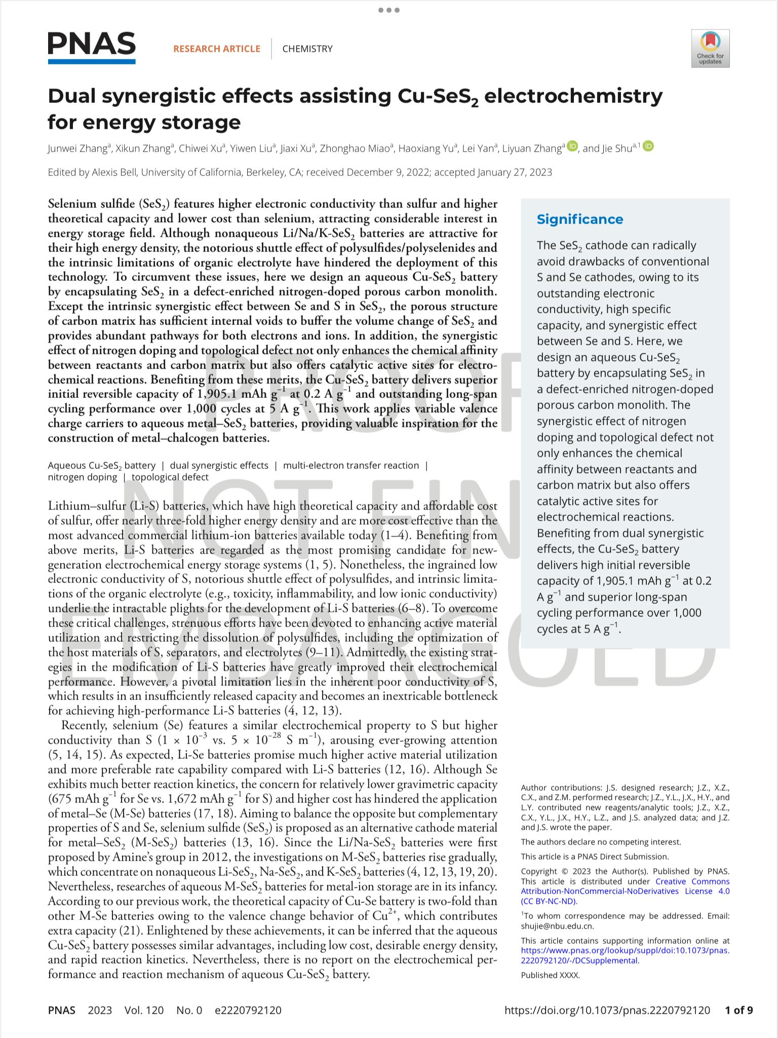 近日,有爱爱 能源化学团队针对水系硫族电池中的关键科学问题开展了前瞻性的研究,利用双协同作用提升了电极材料的可逆转化能力,进而构建了高性能的水系柔性电池,相关结果发表在美国科学院院刊PNAS上,有爱爱 是论文的唯一署名单位,硕士生张俊伟为第一作者,舒杰教授为通讯作者。