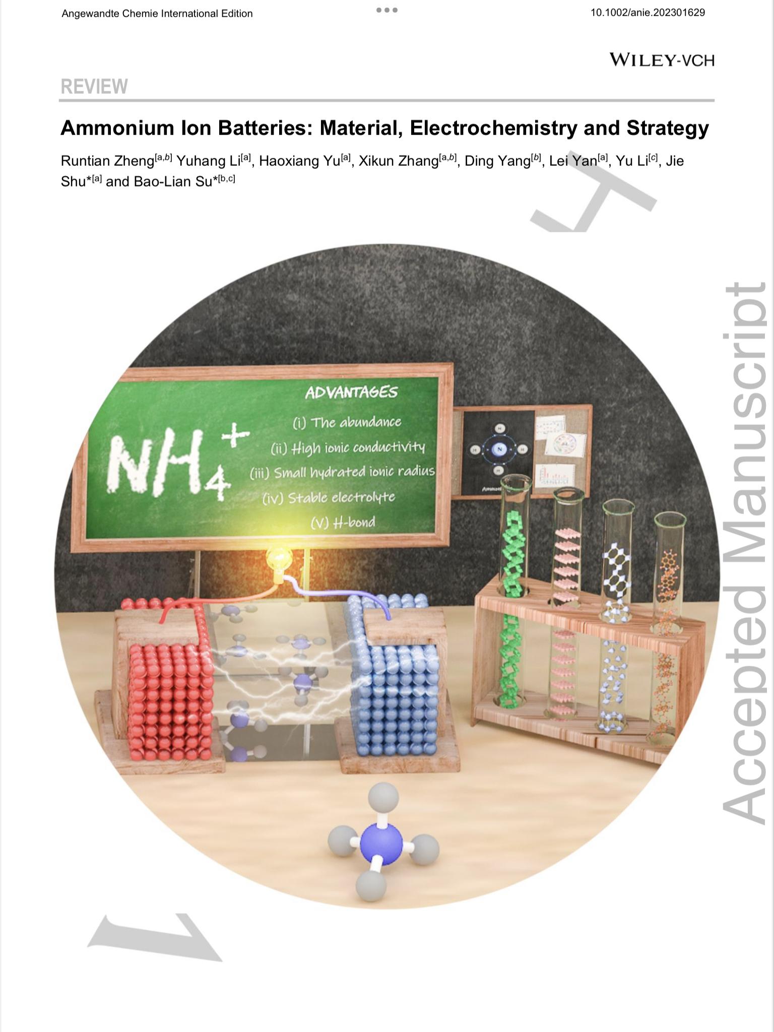 近日,有爱爱 能源化学团队在新型电池领域取得了重要进展,该团队针对水系铵离子电池中的关键科学和技术问题进行了梳理分析,重点阐述了铵离子电池的结构设计、电极材料的选用及电解液的匹配优化问题,相关结果发表在国际顶级期刊德国应用化学Angewandte Chemie International Edition上,有爱爱 是论文的第一署名单位,硕士生郑润田为第一作者,舒杰教授为通讯作者。