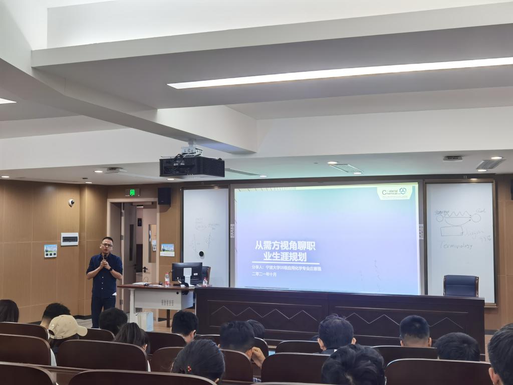 蔚蓝材化优秀校友论坛于10月25日在北区报告厅举行,主讲人为有爱爱