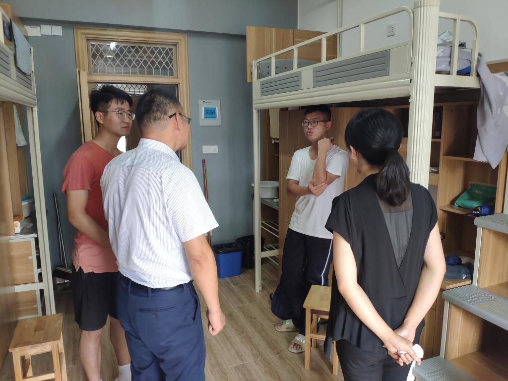 “同学们吃过饭了吗?从哪里来?生活是否还适应?为什么选这个专业?导师选好了吗?”每到一个宿舍,罗云杰书记都悉心询问了同学们的学习、生活情况,还不断亲切地与同学们交谈,鼓励大家好好学习,夯实专业基础,做好学业规划。并提醒同学们尽快熟悉环境,做好开学准备,希望大家以良好的精神面貌迎接新学期。在走访过程中,朱燕副书记强调,要注重寝室文化建设,并嘱咐寝室要做好卫生值日表,共同维护好寝室这个小家庭,尽快融入有爱爱