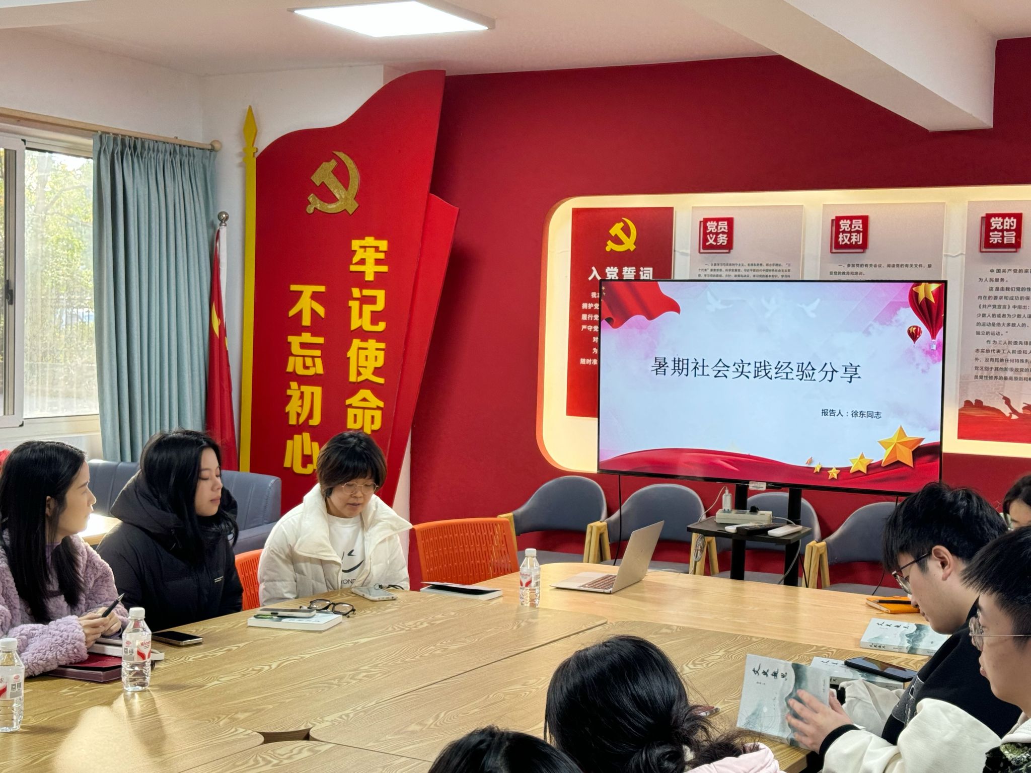 支部党员代表分享了暑期在岚山村家圆农场等地开展社会实践的经历。同学们将《文史趣思》中对乡土文化与历史传承的思考,与“化学+农业”的科技服务实践相结合,讲述了如何把文史关怀融入乡村振兴一线,在实践中践行学生党员的初心与担当。