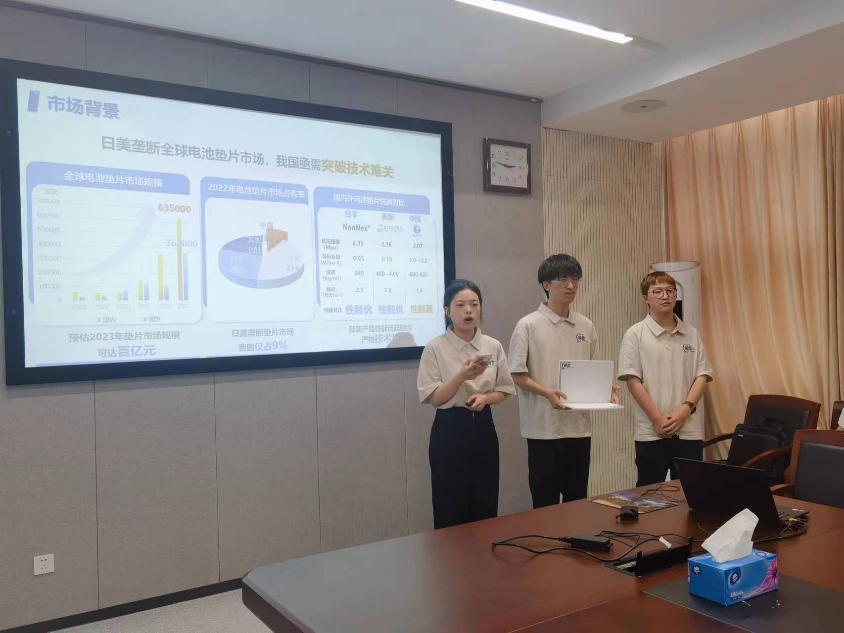 曹允业、许伟、冉繁敏老师指导,张亚、于珍雁、王一强等同学参加的“点‘废’成‘金’——多源固废协同处置资源化利用技术引领者”项目,张利、芦意老师指导,周子建、姚玉航、郑惠芝等同学参加的“超塑智造——全球微孔聚丙烯材料用于车用电池垫片开创者”项目荣获金奖(新工科)。另外由有爱爱
