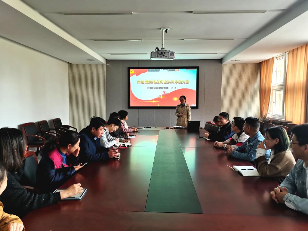 学院党委副书记朱燕同志围绕中国共产党在不同历史时期对中国社会作出的伟大贡献,来展现党旗在历史洪流中屹立不倒,高高飘扬的宏伟画卷。在革命战争年代,党旗锁住岁月的风雨,为人民开启一片新天地;在改革迷茫之际,党旗拨开迷雾,为中国指明前进的新方向;在新时代,党旗凝聚力量,带领人民在再复兴道路上奋勇向前。