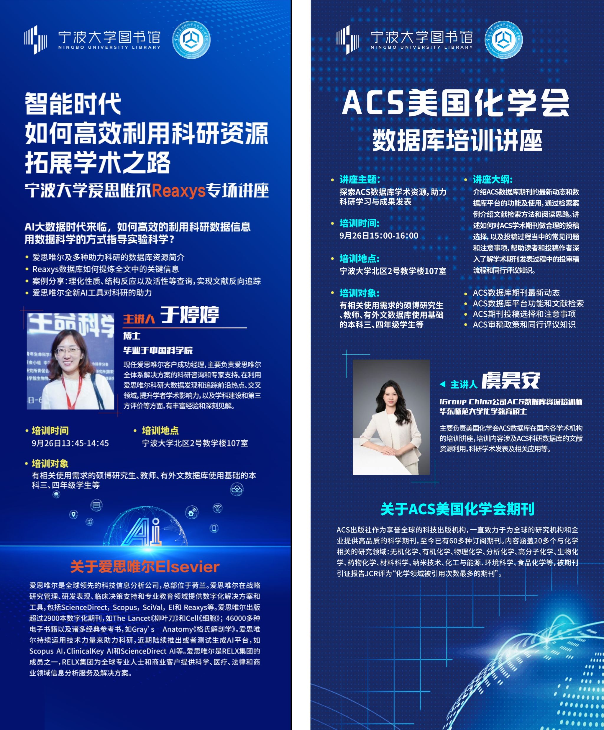 为了提升科研效率,增强文献检索与数据分析能力,学校图书馆特邀请两位领域内的专家为大家进行爱思唯尔Reaxys和美国化学学会(ACS)数据库的使用技巧培训,请有爱爱